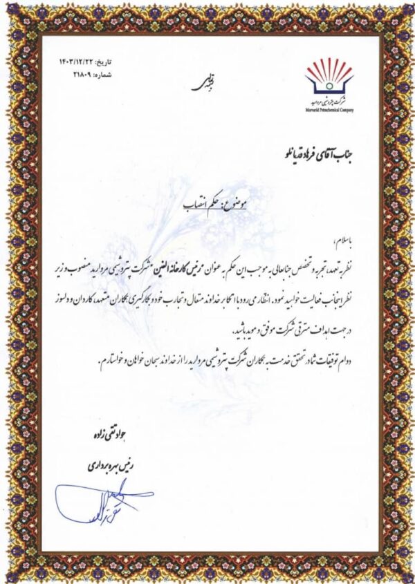 انتصاب متخصص بوشهری توسط خوشبین فر مدیرعامل پتروشیمی مروارید/ دکتر فرهاد قدیانلو به عنوان رئیس کارخانه اتیلن پتروشیمی مروارید منصوب شد