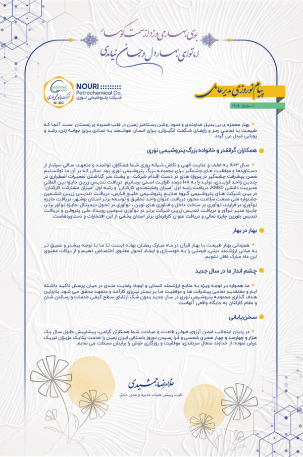 عسلویه آنلاین _ پیام دکتر غلامرضا جمشیدی، مدیر عامل شرکت پتروشیمی نوری به مناسبت فرا رسیدن نوروز ۱۴۰۴