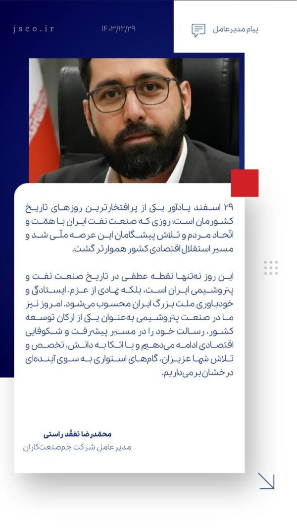 عسلویه آنلاین - محمد رضا تفقد راستی مدير عامل شرکت جم صنعت کاران در پیامی سالروز ملی شدن صنعت نفت را تبریک گفت