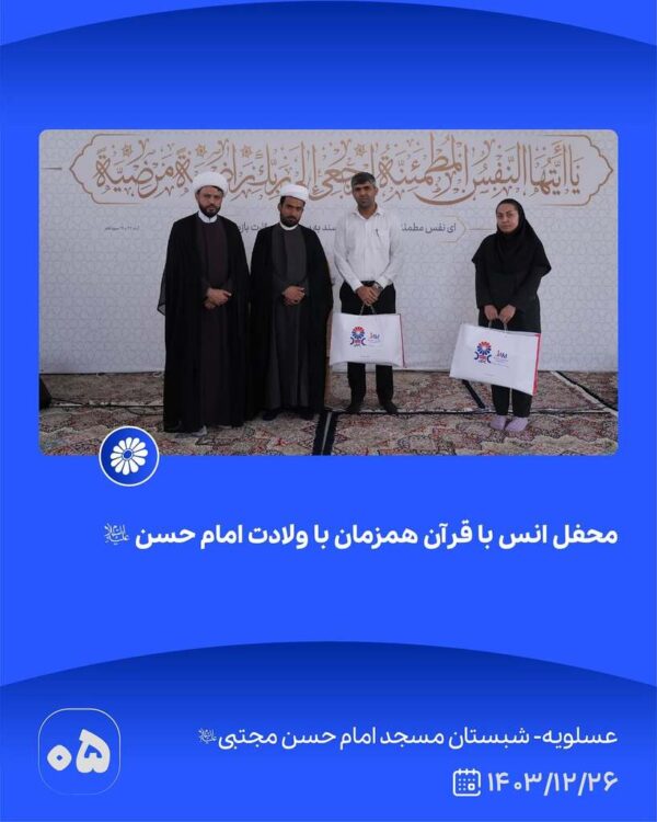 عسلویه آنلاین - محفل انس با قرآن همزمان با ولادت امام حسن علیهالسّلام بیستوششم اسفند ۱۴۰۳ عسلویه – شبستان مسجد امام حسن مجتبی