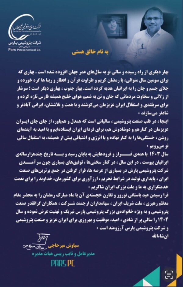 عسلویه آنلاین - پیام مهندس میرحاجی مدیرعامل شرکت پتروشیمی پارس به مناسبت آغاز سال خورشیدی ۱۴۰۴