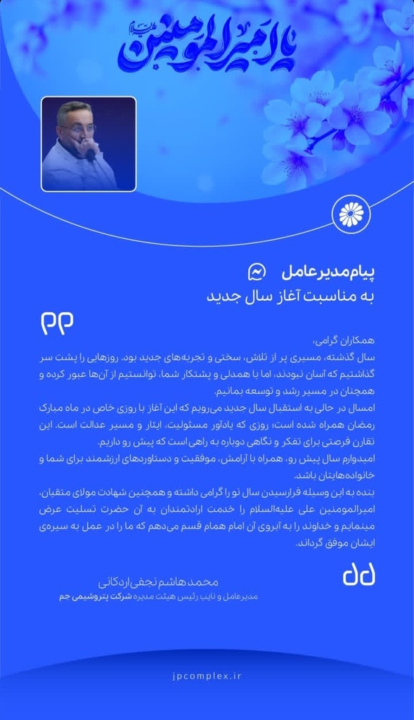 عسلویه آنلاین - پیام دکتر نجفی اردکانی مدیرعامل شرکت پتروشیمی جم به مناسبت فرارسیدن نوروز باستانی