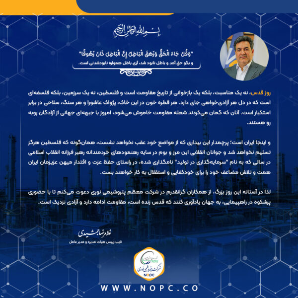 پیام مدیر عامل شرکت پتروشیمی نوری به مناسبت روز جهانی قدس