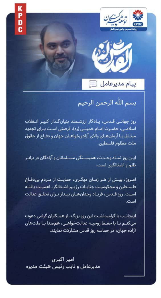 پیام مدیر عامل شرکت توسعه پلیمر کنگان به مناسبت روز جهانی قدس