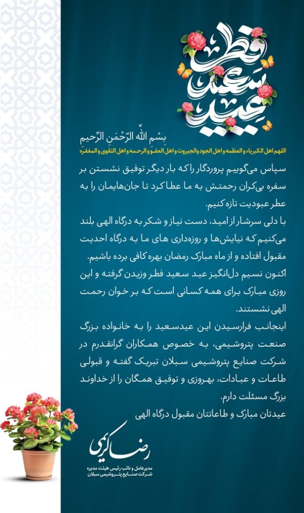 عسلویه آنلاین - پیام تبریک مهندس رضا کریمی مدیرعامل و نایب رئیس هیئت مدیره شرکت صنایع پتروشیمی سبلان به مناسبت فرارسیدن عید سعید فطر