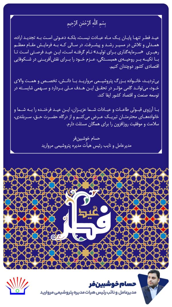 پیام مدیرعامل پتروشیمی مروارید به مناسبت عید سعید فطر