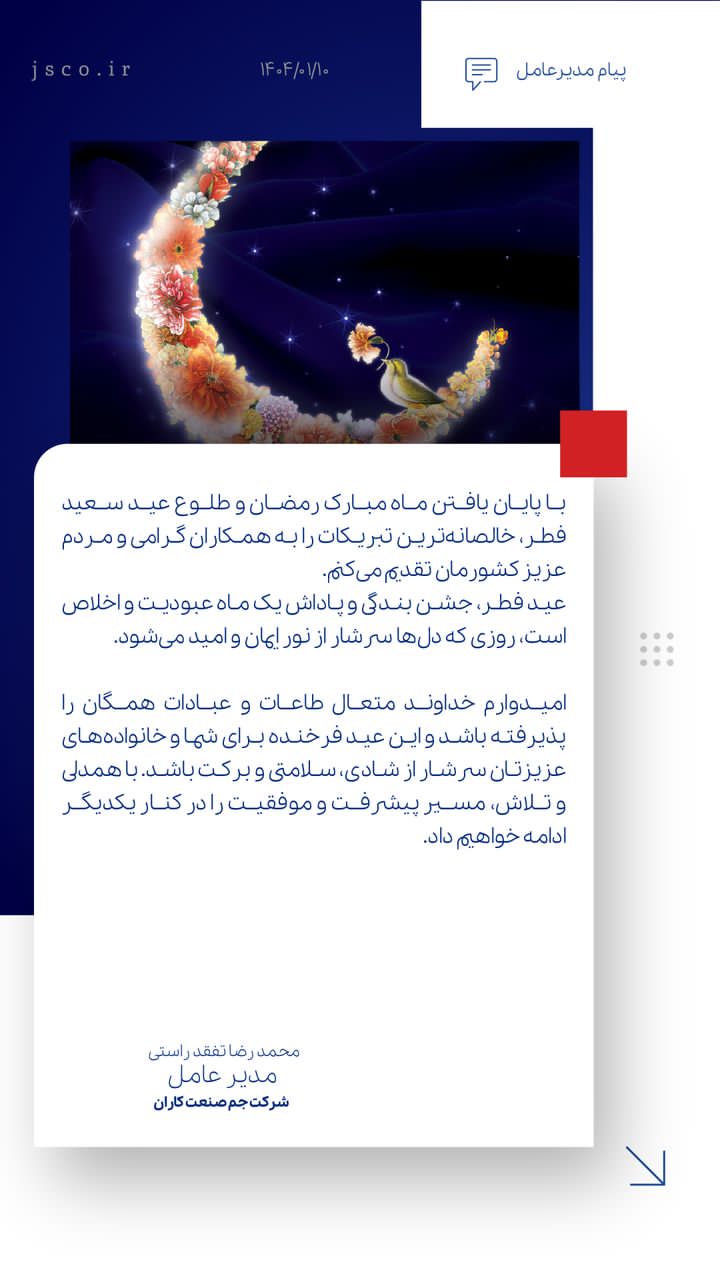 پیام مدیرعامل شرکت جم صنعتکاران به مناسبت عید سعید فطر