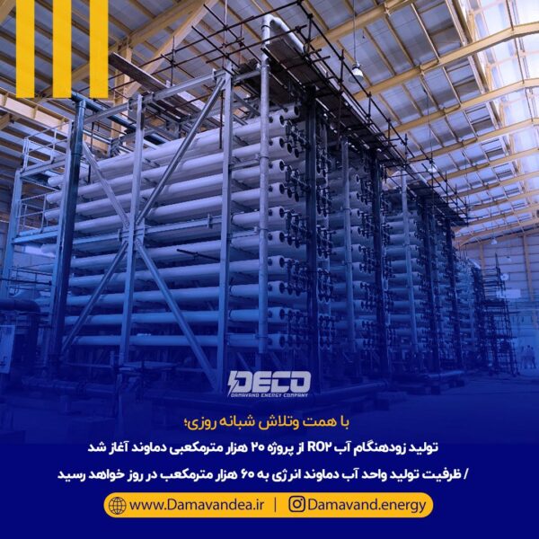 با همت وتلاش شبانه روزی؛ تولید زودهنگام آب RO2 از پروژه ۲۰ هزار مترمکعبی دماوند آغاز شد/ ظرفیت تولید واحد آب دماوند انرژی به ۶۰ هزار مترمکعب در روز خواهد رسید