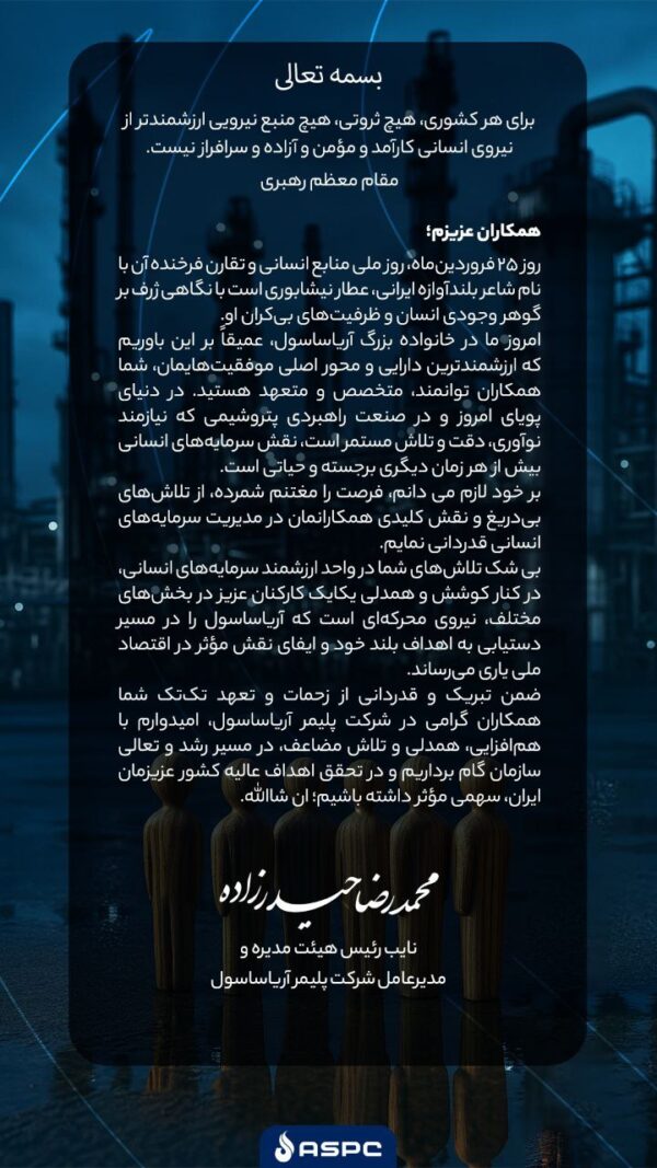 پیام تبریک مدیرعامل شرکت پتروشیمی آریا ساسول به مناسبت روز ملی منابع انسانی