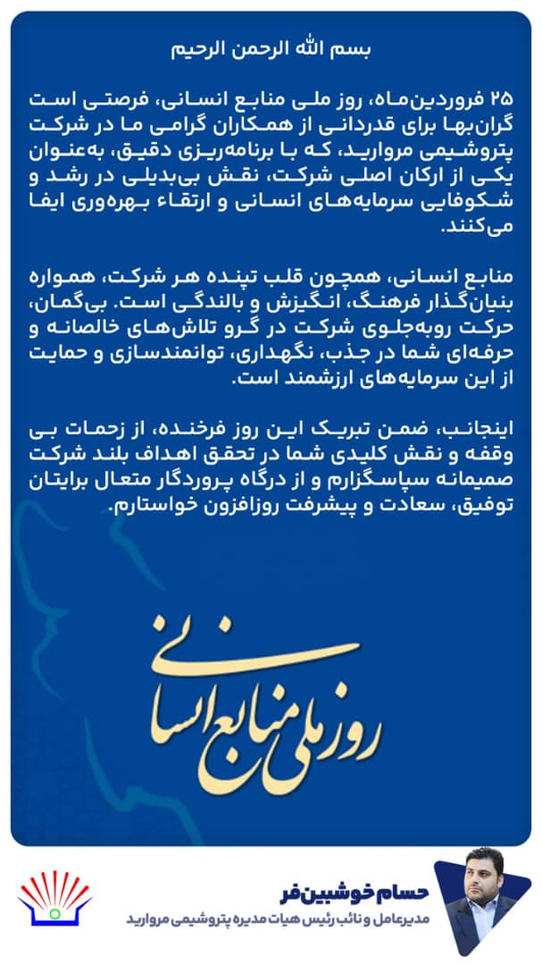 پیام تبریک مدیرعامل پتروشیمی مروارید به مناسبت فرارسیدن روز منابع انسانی