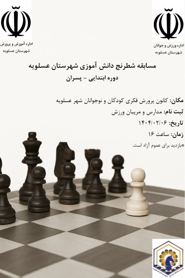عسلویه آنلاین _ مسابقه شطرنج ویژه دانشآموزان دوره ابتدایی (پسران) با همکاری اداره آموزش و پرورش و اداره ورزش و جوانان این شهرستان برگزار خواهد شد.