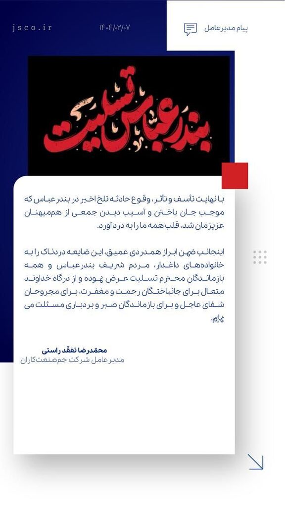پیام تسلیت مدیر عامل شرکت جم صنعتکاران به مناسبت حادثه دردناک بندرعباس