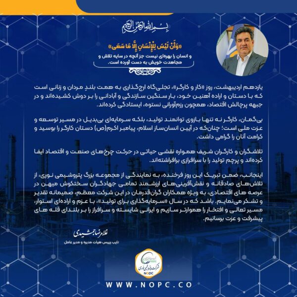 پیام مدیر عامل پتروشیمی نوری به مناسبت گرامیداشت روز جهانی کار و کارگر
