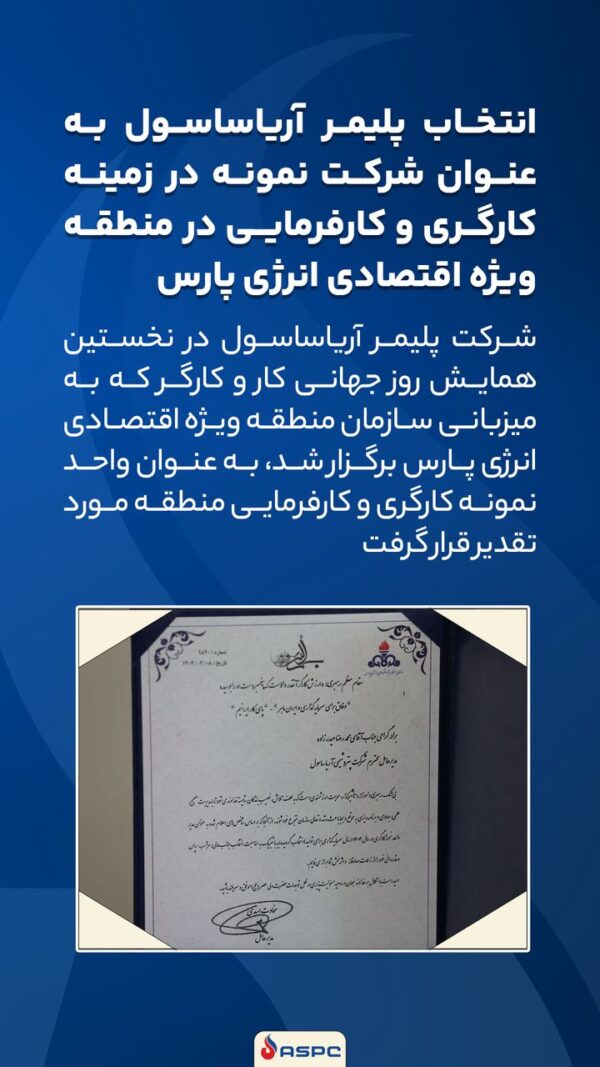 شرکت پلیمر آریاساسول شرکت نمونه در زمینه کارگری و کارفرمایی در منطقه ویژه اقتصادی پارس عسلویه انتخاب شد