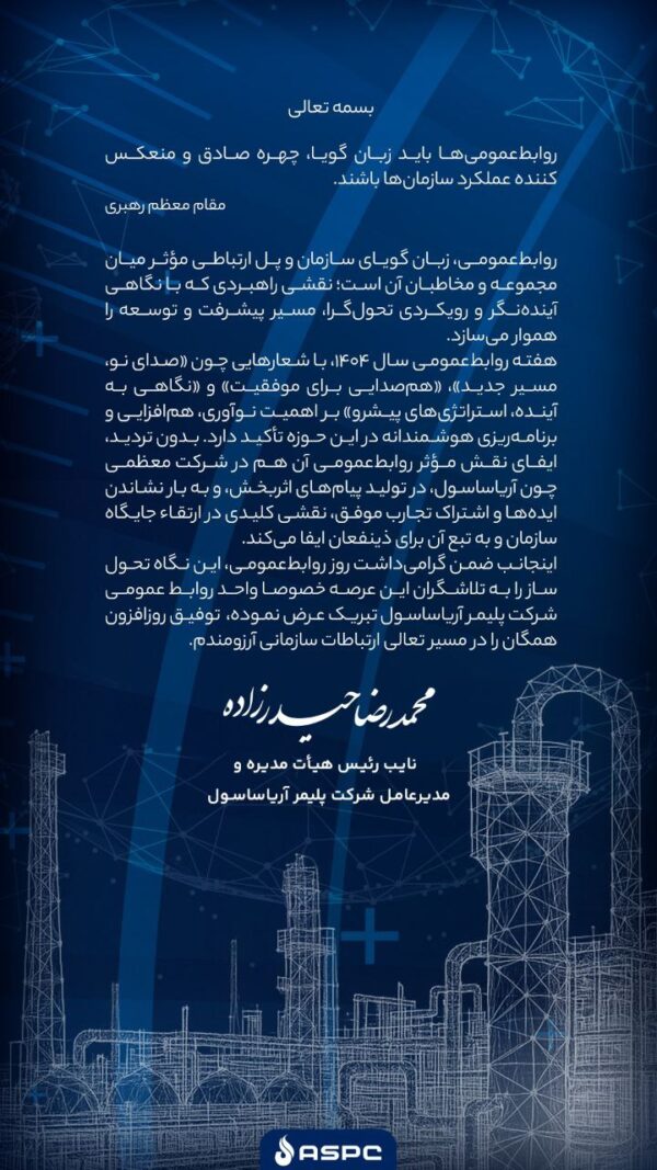 پیام تبریک مدیر عامل شرکت پلیمر آریا ساسول به مناسبت فرا رسیدن روز ارتباطات و روابط عمومی