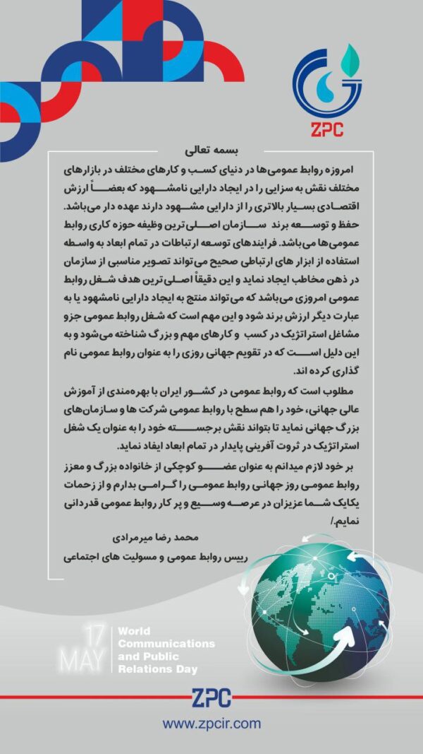 عسلویه آنلاین _ سید محمدرضا میرمرادی رئیس روابطعمومی و مسئولیتهای اجتماعی شرکت پتروشیمی زاگرس به مناسبت روز جهانی ارتباطات و روابط عمومی پیامی صادر کرد.