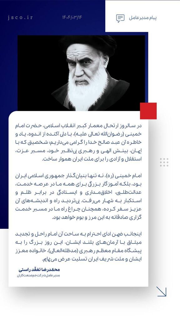 پیام مدیرعامل شرکت جم صنعتکاران به مناسبت فرارسیدن سالروز رحلت حضرت امام خمینی (ره)