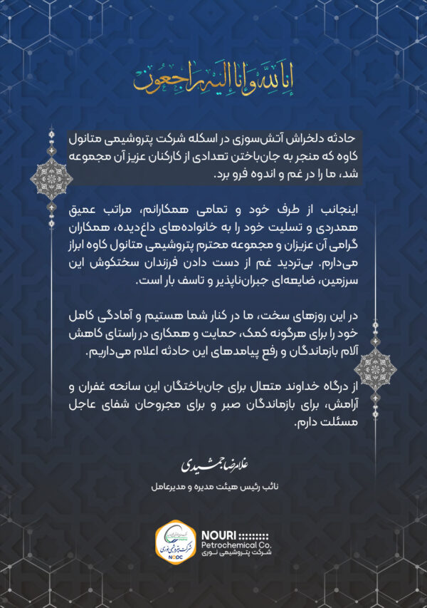 پیام تسلیت شرکت پتروشیمی نوری در پی حادثه ناگوار آتشسوزی اسکله متانول کاوه