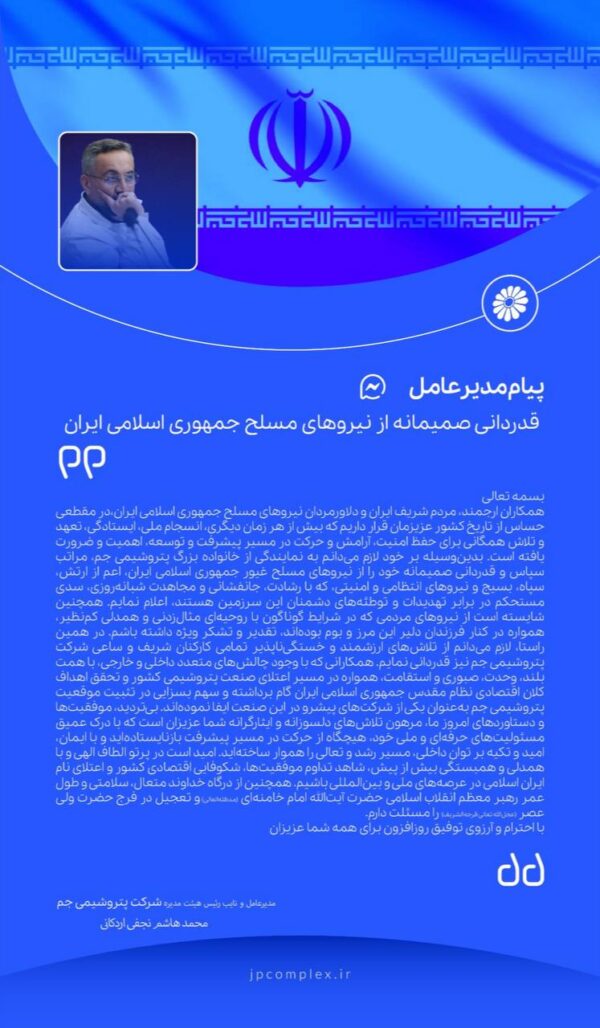 پیام قدردانی مدیر عامل پتروشیمی جم از نیروهای مسلح جمهوری اسلامی ایران