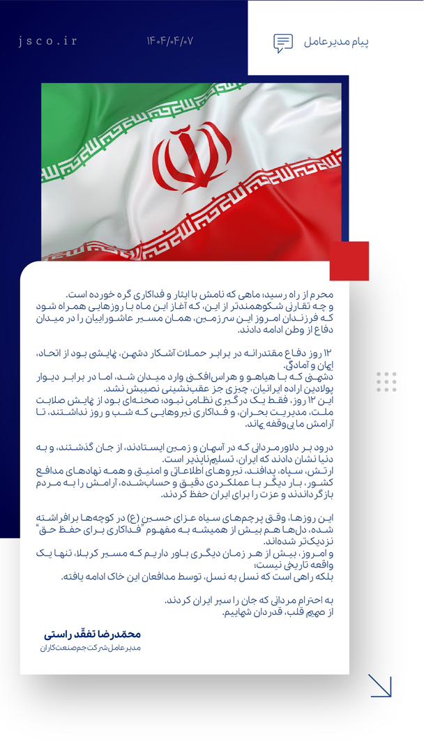 پیام مدیرعامل و نایب رئیس هیئت مدیره شرکت جم صنعتکاران به مناسبت تقدیر از نیروهای مسلح همزمان با آغاز دهه اول محرم