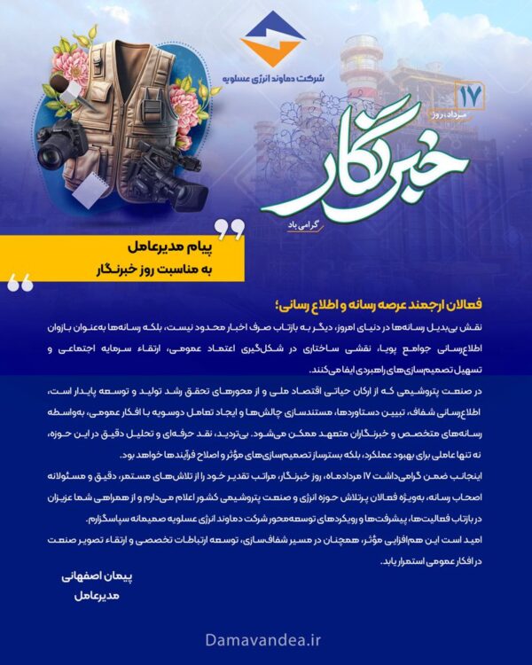 پیام مدیرعامل شرکت دماوند انرژی عسلویه به مناسبت فرا رسیدن روز خبرنگار