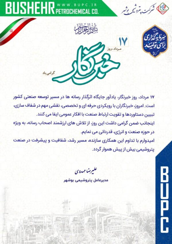 پیام مدیرعامل پتروشیمی بوشهر به مناسبت روز خبرنگار