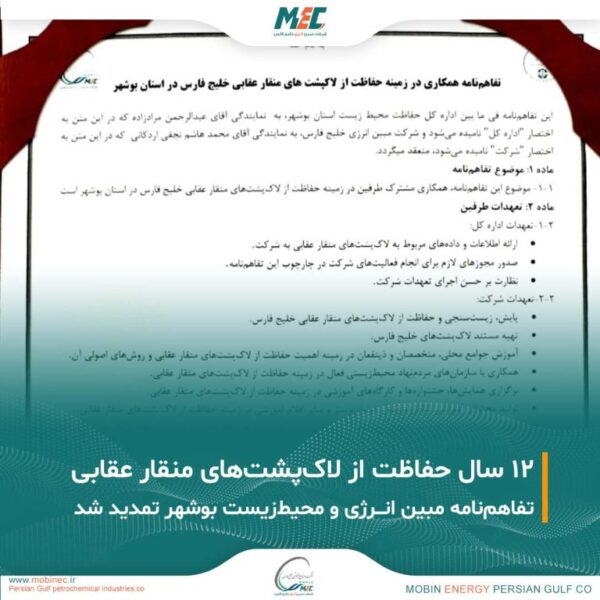 این تفاهمنامه میان شرکت مبین انرژی خلیج فارس و اداره کل محیط زیست استان بوشهر با هدف صیانت و پایش زیستگاههای حساس این گونه ارزشمند دریایی در استان بوشهر منعقد شد.