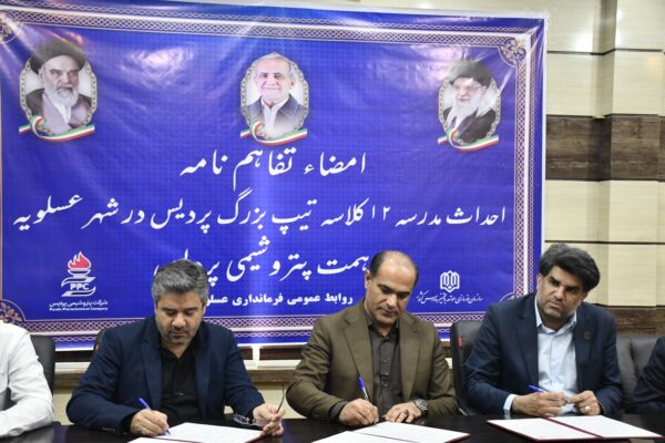 به گزارش عسلویه آنلاین، تفاهمنامه احداث یک مدرسه ۱۲ کلاسه بین شرکت پتروشیمی پردیس و ادارهکل نوسازی، توسعه و تجهیز مدارس استان بوشهر با حضور دکتر پاسالار فرماندار شهرستان عسلویه، مهندس قنبریان مدیرعامل پتروشیمی پردیس و مهندس احمدی مدیرکل نوسازی مدارس استان به امضا رسید.