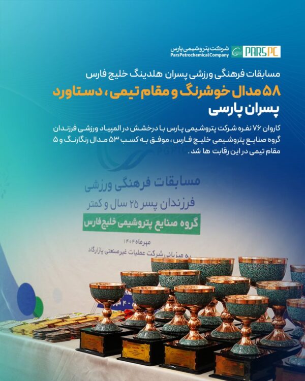 به گزارش عسلویه آنلاین به نقل از روابط عمومی پتروشیمی پارس؛ در این مسابقات که از ۲۹ شهریور لغایت ۴ مهرماه در شیراز و به میزبانی شرکت عملیات غیرصنعتی پازارگاد برگزار شد، پسران پتروشیمی پارس در رشتههای تنیس روی میز زیر ۱۷ و ۱۸–۲۵ سال، شطرنج زیر ۱۷ سال، شنا، فوتسال زیر ۱۷ و ۱۸–۲۵ سال و دو و میدانی درن المپیاد ورزشی فرزندان گروه صنایع پتروشیمی خلیج فارس به مصاف حریفان خود رفتند که تیم دو و میدانی پسران پتروشیمی پارس در این رقابت ها توانست با کسب ۱۴ مدال طلا، ۴ نقره و ۴ برنز، در جایگاه اول این مسابقات قرار گیرد.