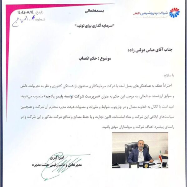 با حکم مدیرعامل پتروشیمی جم؛ مدیرعامل شرکت توسعه پلیمر پادجم منصوب شد