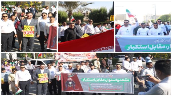 فریاد استکبارستیزی کارکنان پتروشیمی بوشهر در راهپیمایی ۱۳ آبان