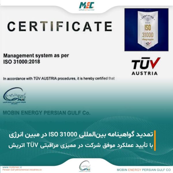 تمدید اعتبار گواهینامه بینالمللی ISO 31000 در شرکت مبین انرژی خلیج فارس