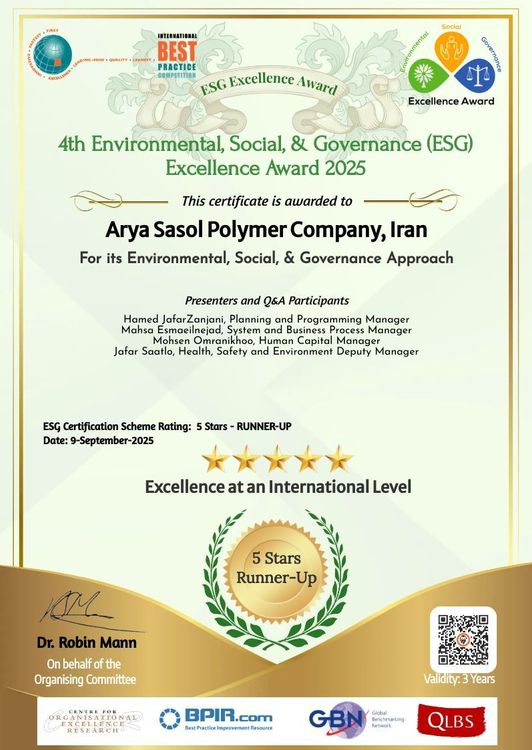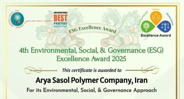 به گزارش عسلویه آنلاین به نقل از روابط عمومی شرکت پلیمر آریاساسول، گواهینامههای چهارمین دوره جایزه تعالی پایداری (ESG) مبتنی بر حوزههای محیط زیست، اجتماع و حاکمیت سال ۲۰۲۵ تحت نظارت مسابقه برترین تجارب بینالمللی (IBPC) (IBPC 4th Environment, Social, Governance Excellence Award 2025) برای آریاساسول صادر شد.