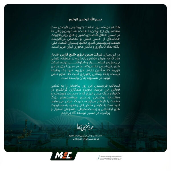 اینجانب فرارسیدن این روز پرافتخار را به تمامی فعالان این عرصه، بهویژه همکاران گرانقدر در خانواده بزرگ مبین انرژی که با مدیریت هوشمند و مقتدرانه «یونیتلی»، زیربنای موفقیتهای بزرگ صنعت را فراهم میآورند، تبریک عرض مینمایم.